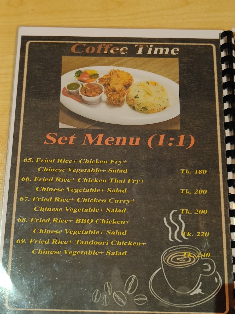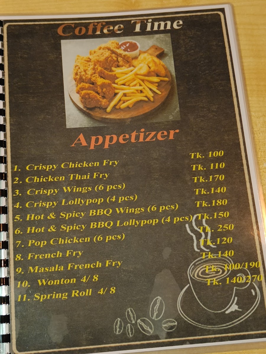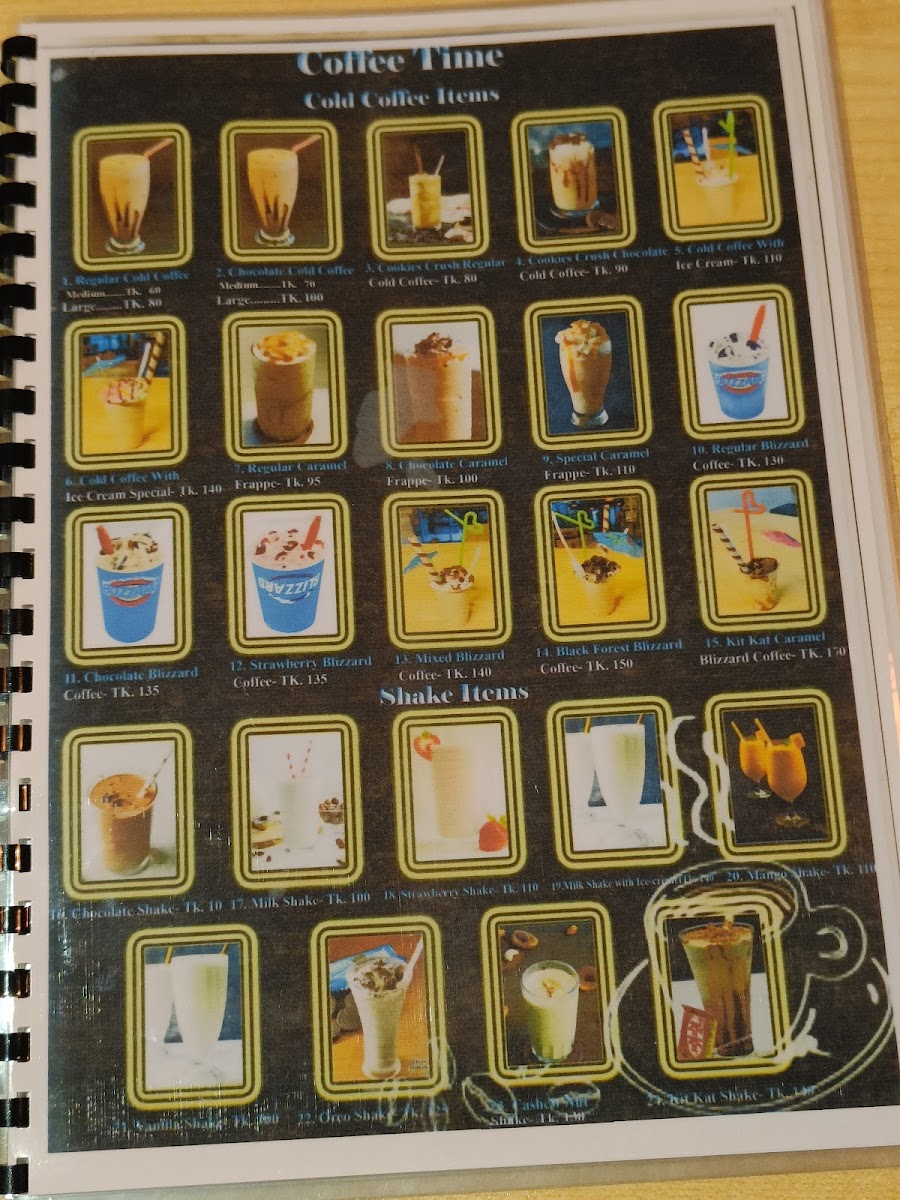 The menu at Coffee Time - Faridpur offers a delightful range of options to cater to various tastes, blending classic favorites with unique twists. For coffee lovers, Regular Hot Coffee and Cappuccino Coffee are popular choices, while those looking for something more indulgent can try the Cold Coffee with Chocolate Ice Cream or the Cold Chocolate Coffee. For a richer experience, the Chocolate Shake, Milkshake, and Oreo Shake provide a creamy and satisfying treat.