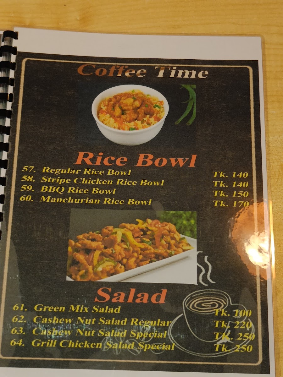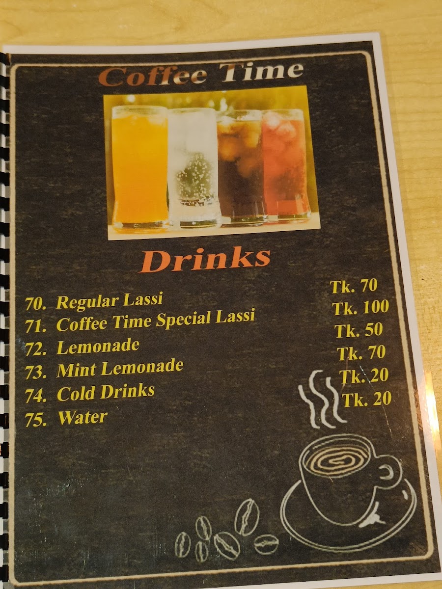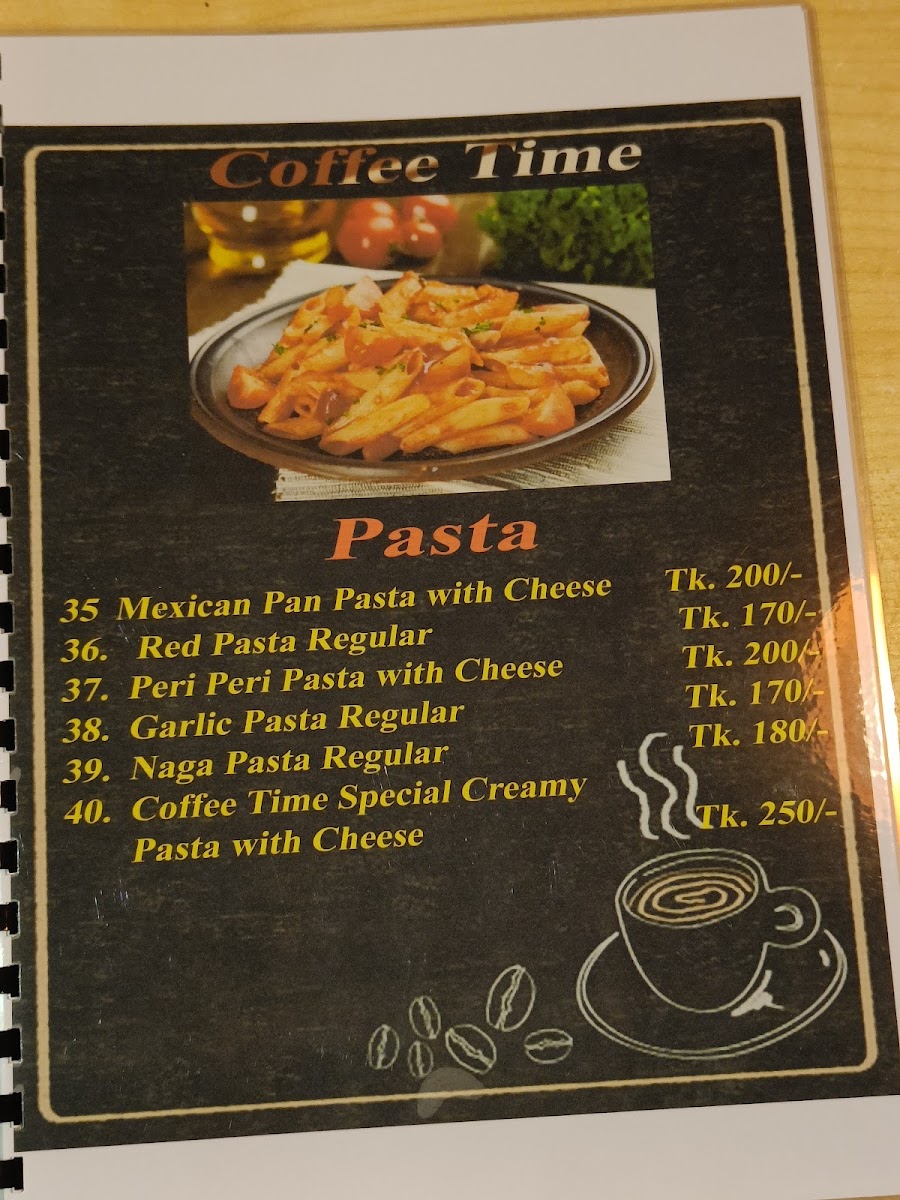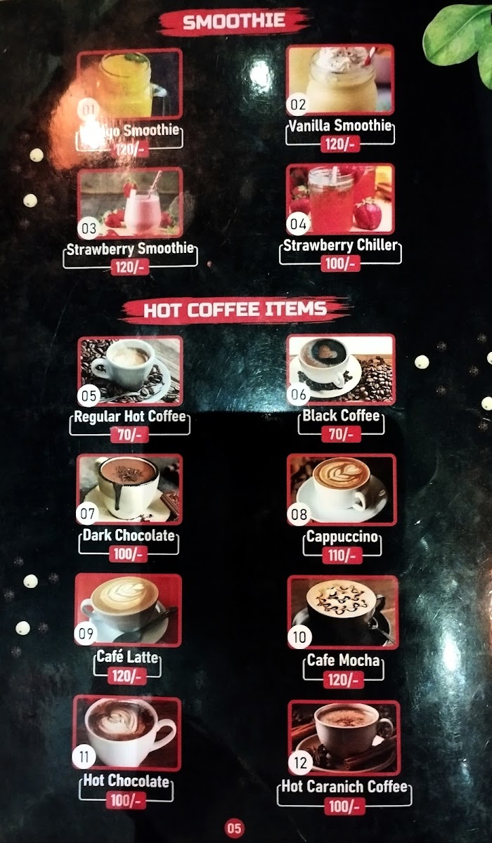 The menu at Coffee Time - Faridpur offers a delightful range of options to cater to various tastes, blending classic favorites with unique twists. For coffee lovers, Regular Hot Coffee and Cappuccino Coffee are popular choices, while those looking for something more indulgent can try the Cold Coffee with Chocolate Ice Cream or the Cold Chocolate Coffee. For a richer experience, the Chocolate Shake, Milkshake, and Oreo Shake provide a creamy and satisfying treat.